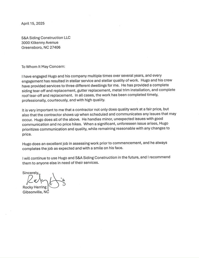 "Hugo and his crews at S&A Siding Construction recently replaced a roof and a rotted wall at my moms home. They did an outstanding job, finished all work ahead of schedule, communicated well during the process and charged a very reasonable price. I highly recommend this company."