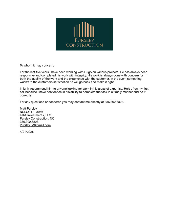 "Hugo and his crew did a great job. They replaced our entire roof and redid our vinyl siding. It looks phenomenal. I would highly recommend them for any exterior work."